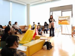 会場は幼児室です。「研修室ではなく、幼児室?何が始まるのかな?」と思われた方もいるかもしれません。田口館長は「今日は皆さんの声を聞きながら、一緒に講座をつくっていきたいと思っています。それで、この場、幼児室を使って、居心地の良さって何だろう?と考えながら、皆さんと安心して話したり聞いたりできる関係をつくれたらいいなと思っています」と語りかけ、参加される皆さんと確認をとりながら講座をスタートしました。