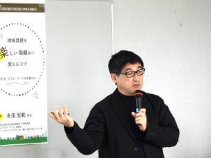 2つめは地域の人たちが仲良く生き生きと暮らす元気なまちを目指す”地域豊穣化”についてです。これには3つの人が必要となります。地域に暮らす「土の人」、そこに寄り添い支援する「水の人」、そして「種」を運んでくる「風の人」です。ここで言う「種」は、地域で行われている行事や取組みを指します。例えば防災訓練や餅つき、運動会などです。永田さんは、このように「風」「水」「土」「種」に例え「昔は土が豊かで、どんな地域行事(種)を植えてもすくすく育っていましたが、地域の繋がりが薄れてきた今は土が乾いた状態で、種が育ち難くなっています。だからといって種を植えないと益々土は枯れる一方です」と地域の現状を話されました。