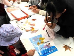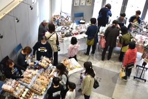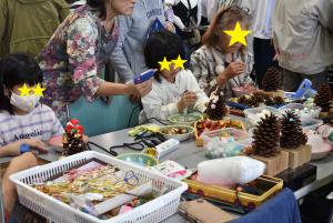 展示コーナー・展示ギャラリー・北ロビー・屋外では、ペットボトルアート・落ち葉アートを作るワークショップ、ボードゲーム体験、クリスマス飾りワークショップ、お手玉遊び体験、点字体験、ハーバリウムボトル体験、フードドライブの展示、防災や非常時に役立つ展示・体験コーナー、授産施設による物品販売等のミニマルシェなど、たくさんの出展でにぎわいました。高校生・大学生による出展ブースもあり、多くの方が足を運び、ワークショップを楽しまれていました。