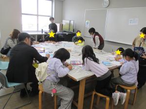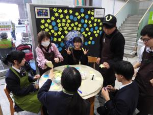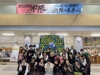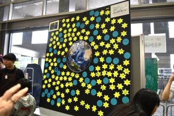 シールラリーのゴール横では、「まなんできたこと、まなんでいること、まなびたいこと、夢」などについて、黄色・青色の星のカードに書いてもらいました。そして、中央に大きな地球の描かれたボードに、皆さんのカードを貼っていき「星のオブジェ」を作成しました。この作品はアバンセ館内に飾っていますので、ご来館の際はぜひご覧ください。※1階北ロビーのエレベーター上側(2階)に展示中