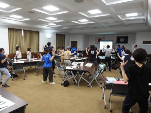 はじめに、場の緊張をほぐすために、みんなで太良を代表する「カニ」のポーズで体操です。