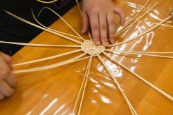 隙間がない様に5cm程の大きさになる位まで編んでいきます。カゴづくりの際に要領を学んだ皆さん。順調に編み進んでいる様子が見られました。ここで、2本の芯の間の部分に目打ちで隙間をつくり、1本籐を足し、3本の芯にして編み進めていきます。そして、また上下上下と編み続けていきます。カゴの蓋となる位の大きさまで編んだら籐の留めを行い、続いて、カゴづくりで学んだうろこ留めを行い、余分な長さの籐を切って完成です。
