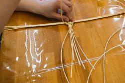 30cm程にカットされた籐の片方の部分を斜めにカットします。横にする部分を手前にして、横に6本、縦に5本、十字になる様にしてずれない様にしっかりと中央部分を持ちます。その十字に合わせて上下上下と籐を2回程巻き付けていきます。