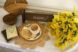 蓋は持ち手の付いたものとコースターにもなるもの2種類から好きな方を選んでつくりました。自分でつくり上げた可愛い蓋付きのカゴが完成し、あちらこちらで満足気な笑顔が見られました。岡本さんが用意されたミモザのフォトコーナーで、完成後は思い思いに写真を撮られていました。